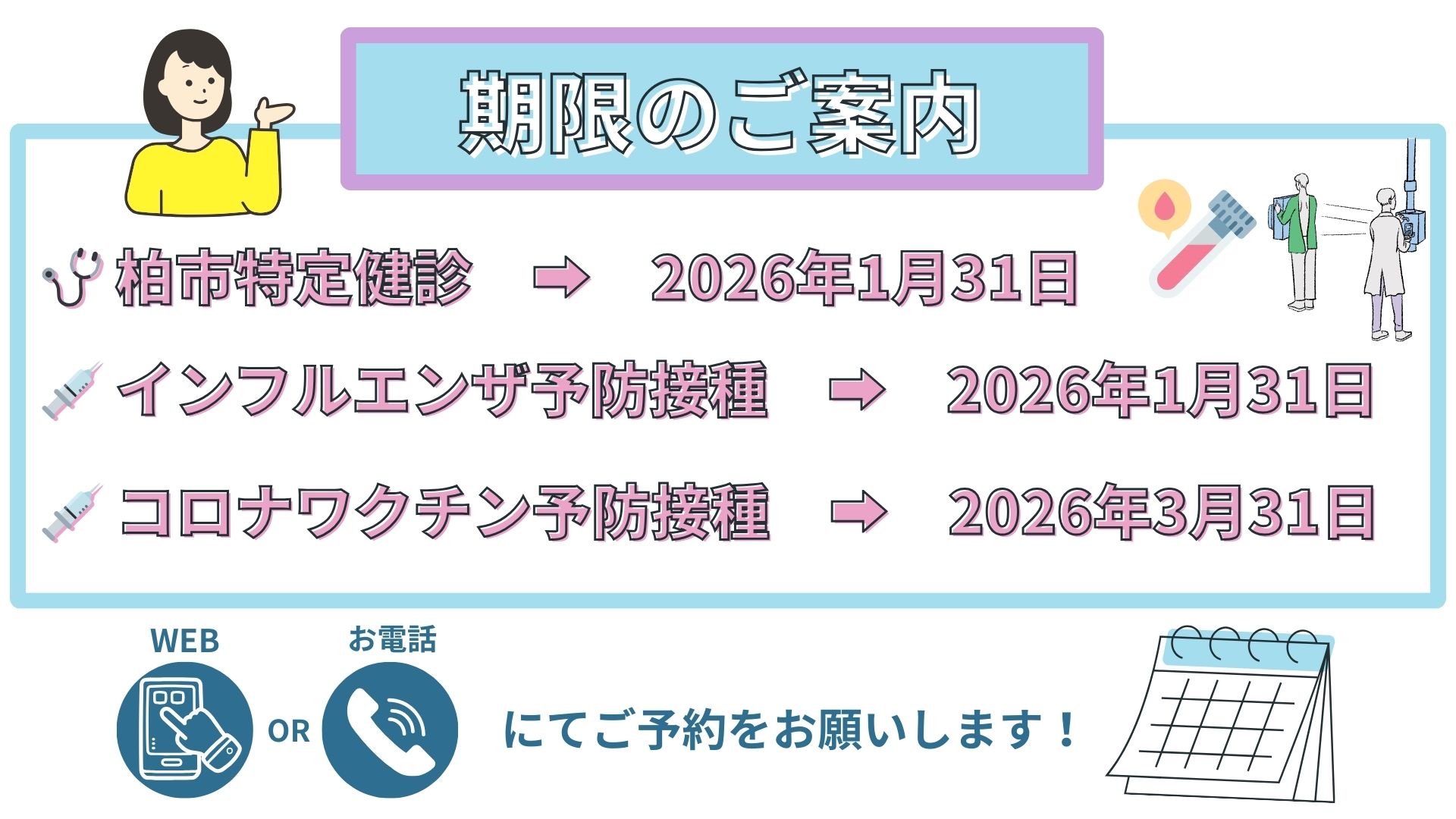 以下の通り、公費対象の健診・予防接種の期限をご案内いたします。
